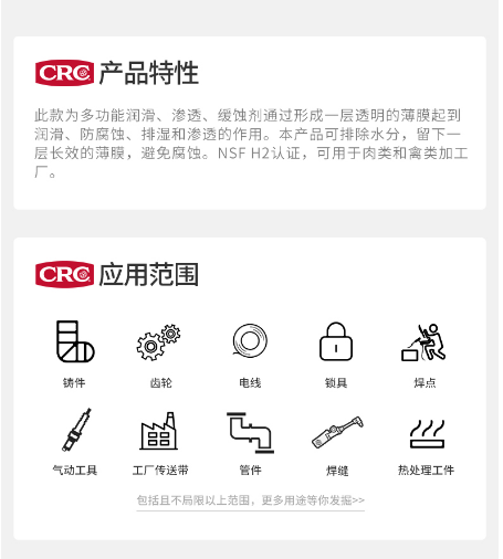 | 多功能潤滑劑、滲透劑、防銹劑去除并隔絕水氣深入腐蝕部分、松懈腐蝕機件潤滑保護、不留任何粘性殘漬清潔輕油和污漬介電強度32500伏特持有NSF、H2注冊認證,可用于食品工業(yè)符合美國單品規(guī)格①MIL-C-81309 TYPE111②NSN 6850-00-050-0659 |
